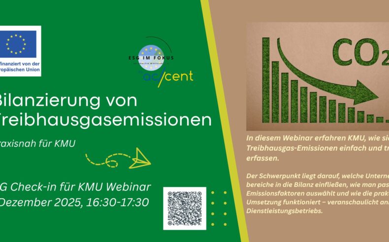Die Webinare sind Teil der Reihe „ESG-Check-in für KMU“, durchgeführt von accent und gefördert durch das Land Niederösterreich und die Europäische Union. In den praxisorientierten einstündigen Online-Seminaren erfahren Sie, wie Sie als KMU mit authentischem Nachhaltigkeitsengagement punkten ohne großes Budget oder Greenwashing.