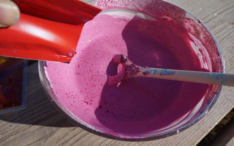 Wasser in die Schüssel geben und mit Gips zu einer klumpenfreien Masse anrühren bis eine breiige Konsistenz entsteht. Ist die Masse zu flüssig, dann einfach mehr Gips einrühren. Die Lebensmittelfarbe gut einrühren bis eine kräftige Farbgebung entsteht.